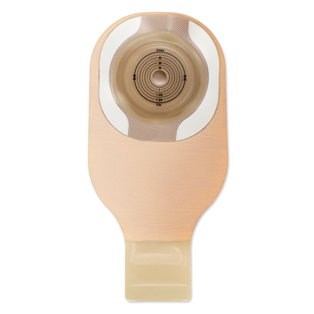 A one-piece, drainable pouching system featuring the CeraPlus skin barrier with Remois technology* that is infused with ceramide. Ceramide is a natural component of human skin that helps to decrease transepidermal water loss (TEWL) from damaged or eroded skin. It is designed to maintain adhesive properties and features a formulation designed to help protect the skin's natural moisture barrier and help maintain good peristomal skin health. The viewing option allows the stoma and output to be observed clearly when the flap is lifted. The integrated Lock 'n Roll microseal closure utilizes plastic interlocking fasteners to create a secure closure at the bottom of the pouch. The AF300 filter allows for a slow release and deodorization of gas from the pouch.